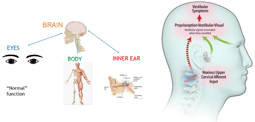 目(視覚)、耳(前庭)、頭と首(体性)から発生する感覚信号は、リアルタイムで脳幹と小脳に伝達されます。頭蓋頸椎の変形により、後頸部の後頭下筋と上部頸椎周辺(筋肉、靱帯、関節)から歪んだ信号が継続的に発生すると、脳幹と小脳では感覚信号が一致しないため、バランス感覚の維持と姿勢調節に失敗してしまいます。