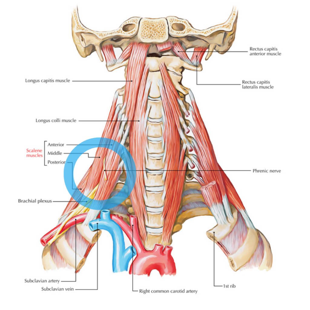 頸椎の横から第一肋骨に下りる斜角筋の過緊張は、第一肋骨を上に持ち上げる強い力として作用します。肋骨と鎖骨の間の空間が狭くなり、斜角筋の過緊張により腕神経叢が圧迫されたり刺激を受けるようになります。これにより腕と肩のしびれ、肩痛、頸部痛、側頭痛症状が持続する可能性があります。