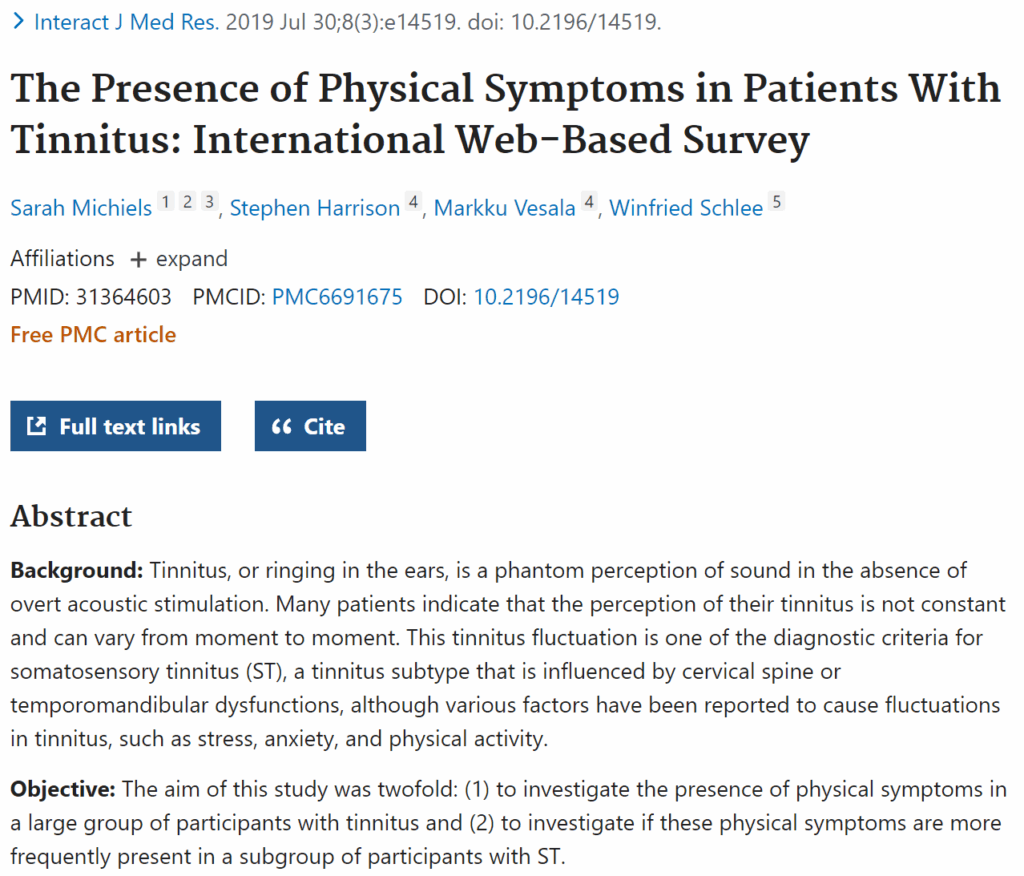 2019年にInteractive journal of medical researchに発表された「The Presence of Physical Symptoms in Patients With Tinnitus: International Web-Based Survey」では、6115名の大規模耳鳴り患者を対象に、頸部、頭部、顎などの身体症状の併発の有無を調査しました。研究結果、6115名中の大多数の耳鳴り患者に様々な身体症状を伴うことが明らかになり、頸椎と顎関節に直接的影響を受ける体性感覚性耳鳴りに分類された患者の場合、このような身体症状がより一般的であることが判明しました。多様なタイプの耳鳴りが頭蓋頸椎不安定性の問題と直接的・間接的な関連性があることを強く示唆するものです。