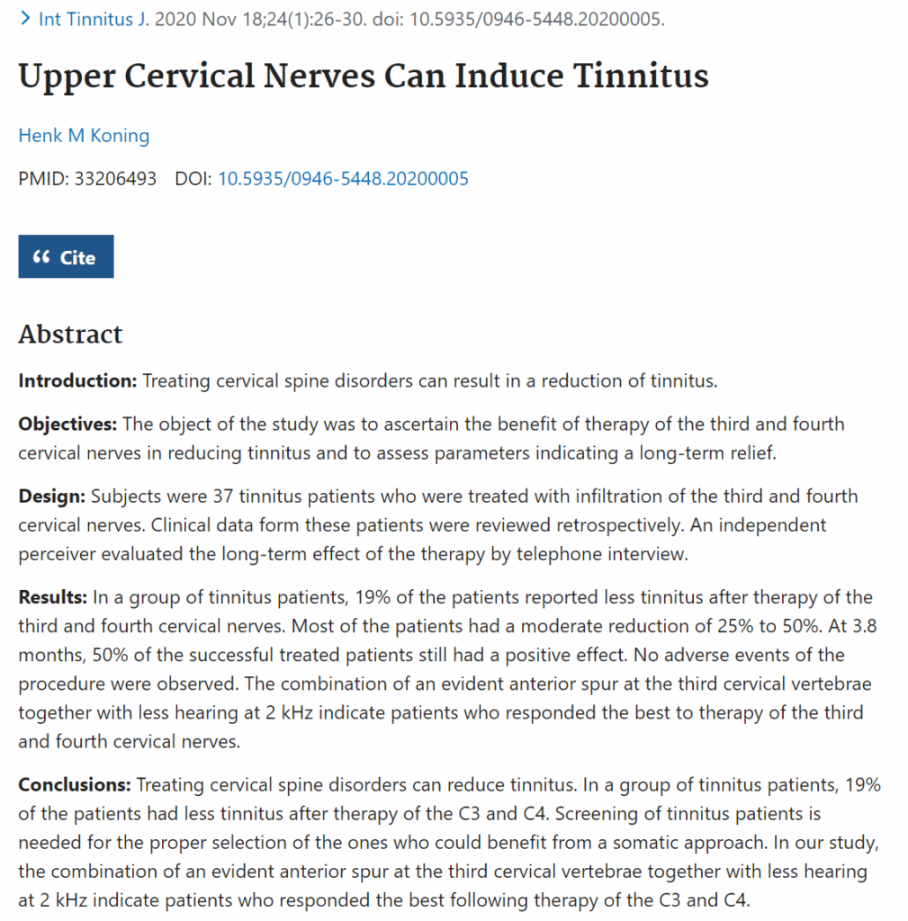 2020年にThe International Tinnitus Journalに発表された「Upper Cervical Nerves Can Induce Tinnitus」では、頸椎に対する治療が耳鳴り症状を減少させることができることが示されました。37名の耳鳴り患者に対して頸椎治療を実施した結果、大多数の患者が25%-50%程度の症状減少を示し、治療に成功した患者の場合、3ヶ月後にも約50%が治療効果が維持されていることが確認されました。