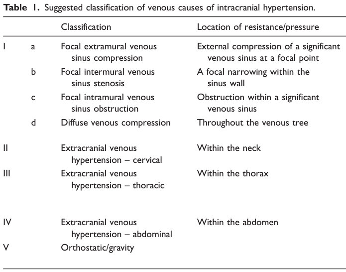 2016年に発表された「Monro-Kellie 2.0: The dynamic vascular and venous pathophysiological components of intracranial pressure」では、頭蓋内圧上昇要因を下表のように分類しました。頭蓋骨折、脳腫瘍、血栓などによる頭蓋内静脈の圧迫、狭窄、遮断が要因となり得、頭蓋外の頸椎、胸部、腹部の静脈圧が高まることが要因となり得ることを示しています。