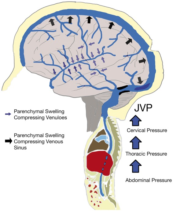 静脈血排出が遅くなると頭蓋内静脈血と脳脊髄液が蓄積し、頭蓋内圧上昇につながります。頭蓋内圧亢進は徐々に大脳皮質に灌流する血流量を減少させ、脳神経細胞の死と脳実質の萎縮へ進行することになります。