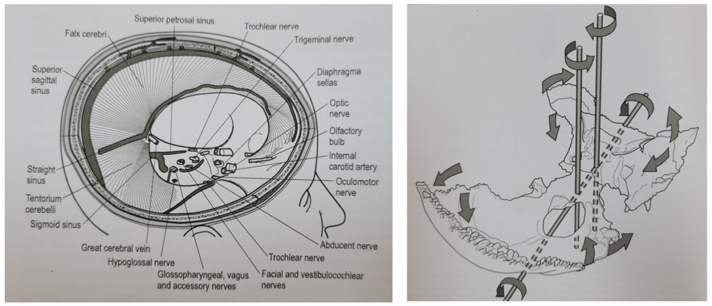頭蓋骨の動きを触診し、脳脊髄液の周期的な膨張と収縮がバランスよく健康な様相で行われているかを確認します。脳脊髄液の膨張と収縮がリズムを失ったり、大きさが弱かったり、片側に偏っていれば、頭蓋底を構成する蝶形骨、側頭骨、後頭骨のすべての関節面の微細で柔軟な動きが行われているかを点検します。頭蓋内硬膜の緊張を変形させる可能性がある、またはこのような変形した緊張トーンから誘発された頭蓋底の機能異常を点検し、正常な緊張トーンが回復するように調整します。
