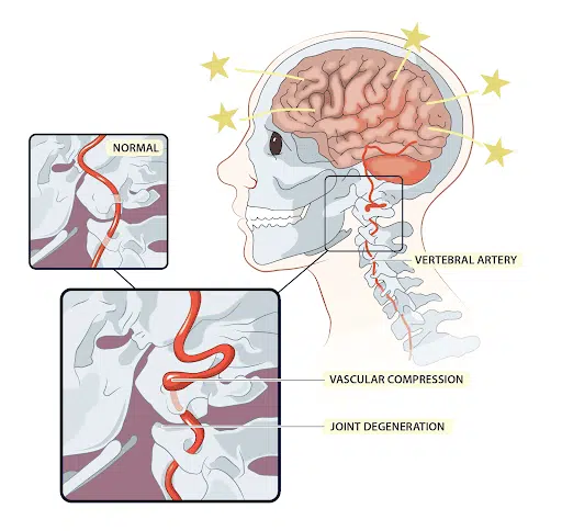 頸椎、特に上部頸椎が歪むと、その間を通過する椎骨動脈が圧迫されます。この動脈は脳幹、前庭器官がある内耳へ向かう主要血管です。